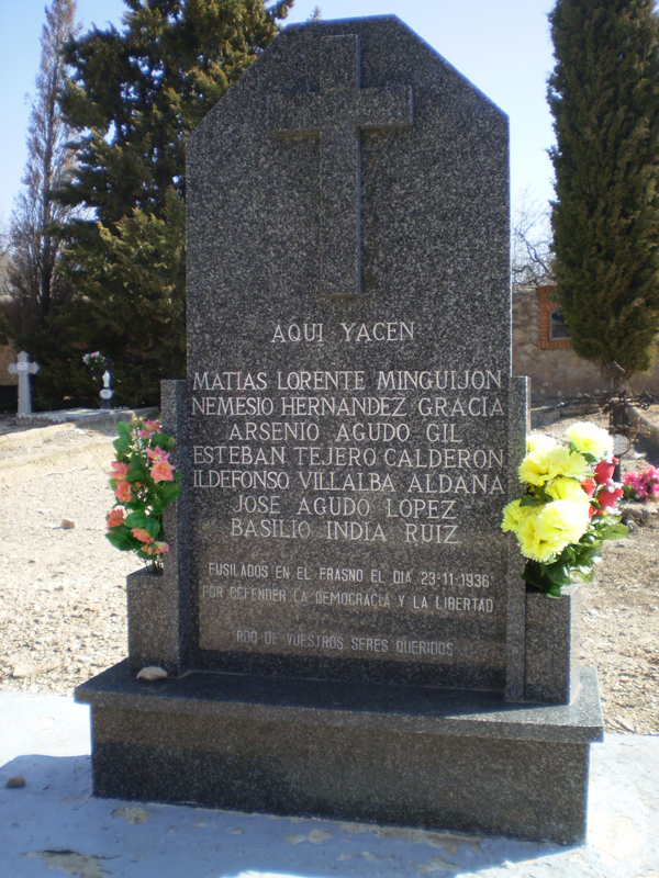 La fosa común existente en el cementerio de Miedes no es exactamente una fosa de la guerra civil, pues recoge en su interior los restos de siete hombres, vecinos de Miedes, que hace unos veinte años años fueron recuperados de la fosa en la que habían yacido durante décadas. Se hallaba en el mismo lugar en el que fueron asesinados, en la “partida del Cuello Muro”, en término de El Frasno.